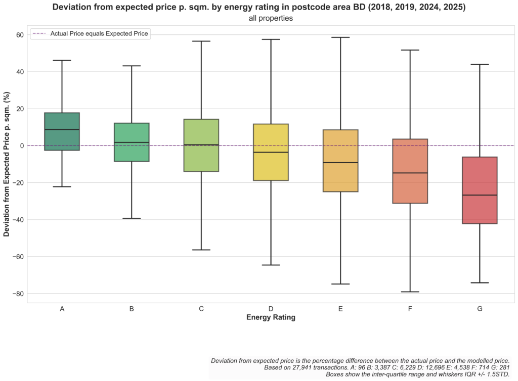 We have not gone into depth to try to explain why the energy performance rating may affect property prices in different ways in different locations, but a quick look reveals that the three postcode areas with the highest variance across EPC classes (Bradford (BD), Blackburn (BB) and Wakefield (WF)) are among the more deprived area in the UK and the three postcode areas with the lowest variance (Chelmsford (CM), Redhill (RH) and Kingston upon Thames (KT) are among the less deprived areas. These are just anecdotal observations that could be worth a deeper analysis.