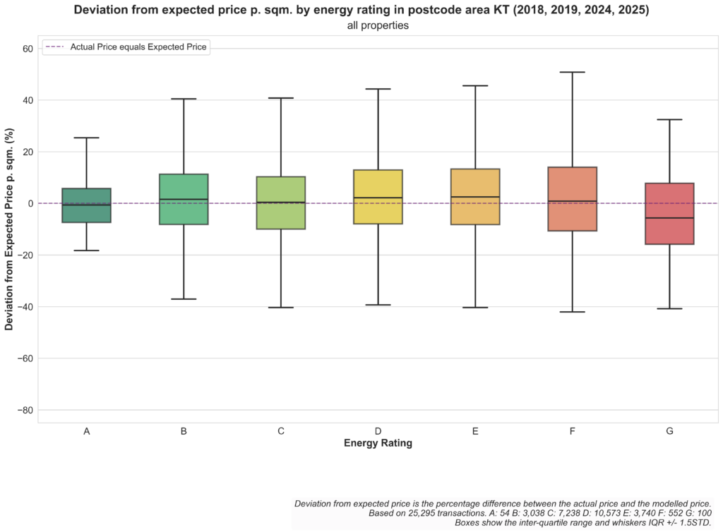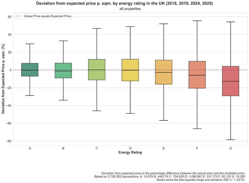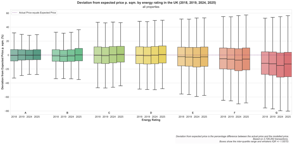 In order to visualize the pricing of properties with different energy performance rating, we plot for each energy rating class the difference of the actual price paid for a property and the expected price according to our model.