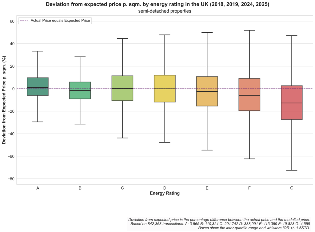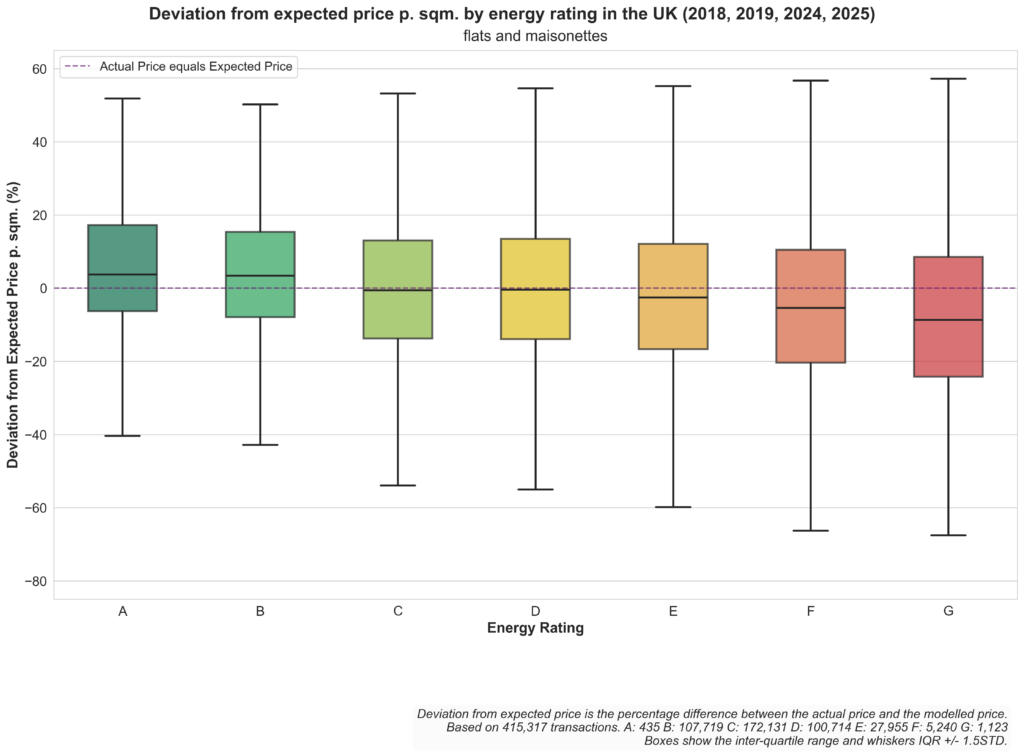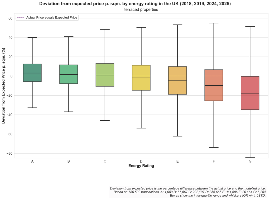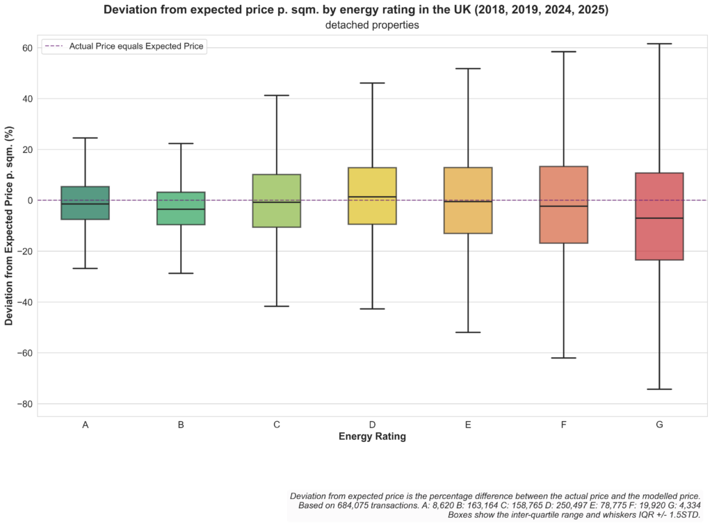 There are some differences between property types. For Flats and maisonettes and Terraced properties with energy performance rating A the actual price is more often than not slightly higher than the expected price. Whereas the price deviation for Detached properties is more even over all energy performance ratings.