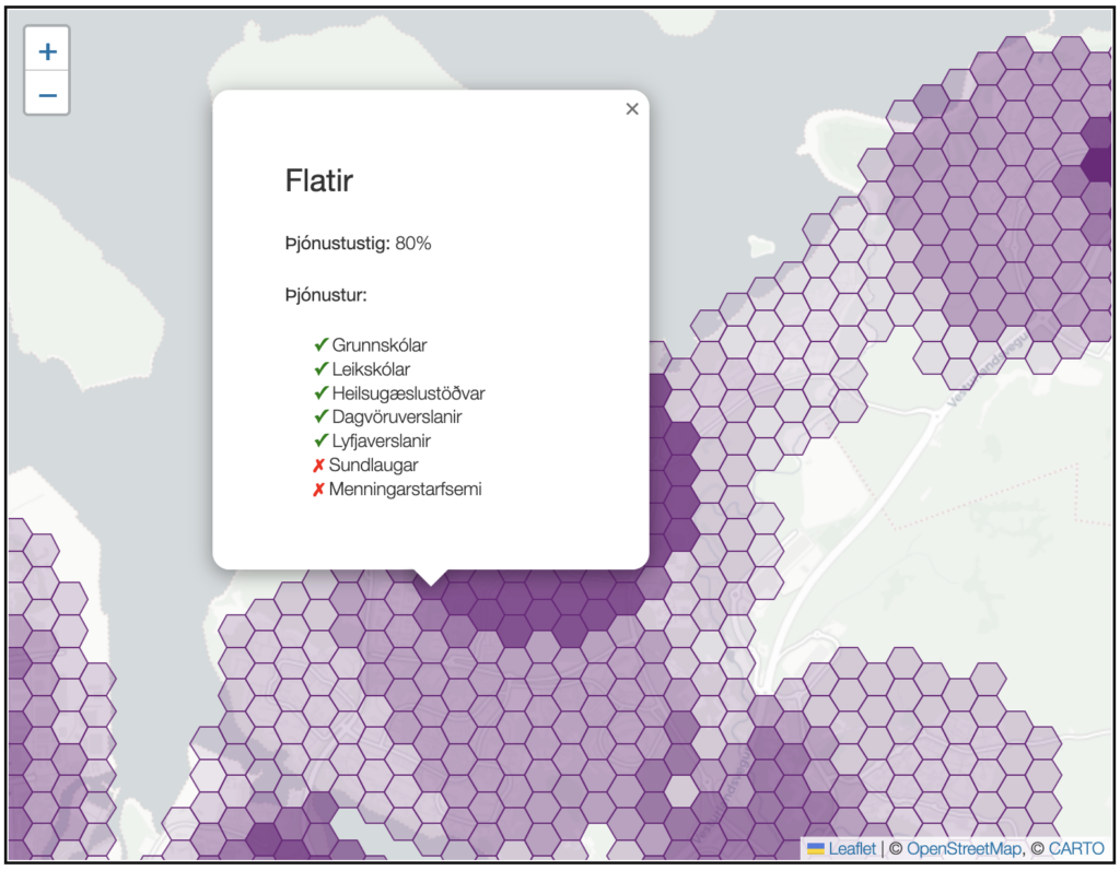 Kortið hér að neðan sýnir fjölbreytni þjónustu í 15 mínutna göngufæri í á höfuðborgarsvæðinu. Þeim dekkri sem að kortið er því fleiri tegundir þjónustu eru aðgengilegar.
