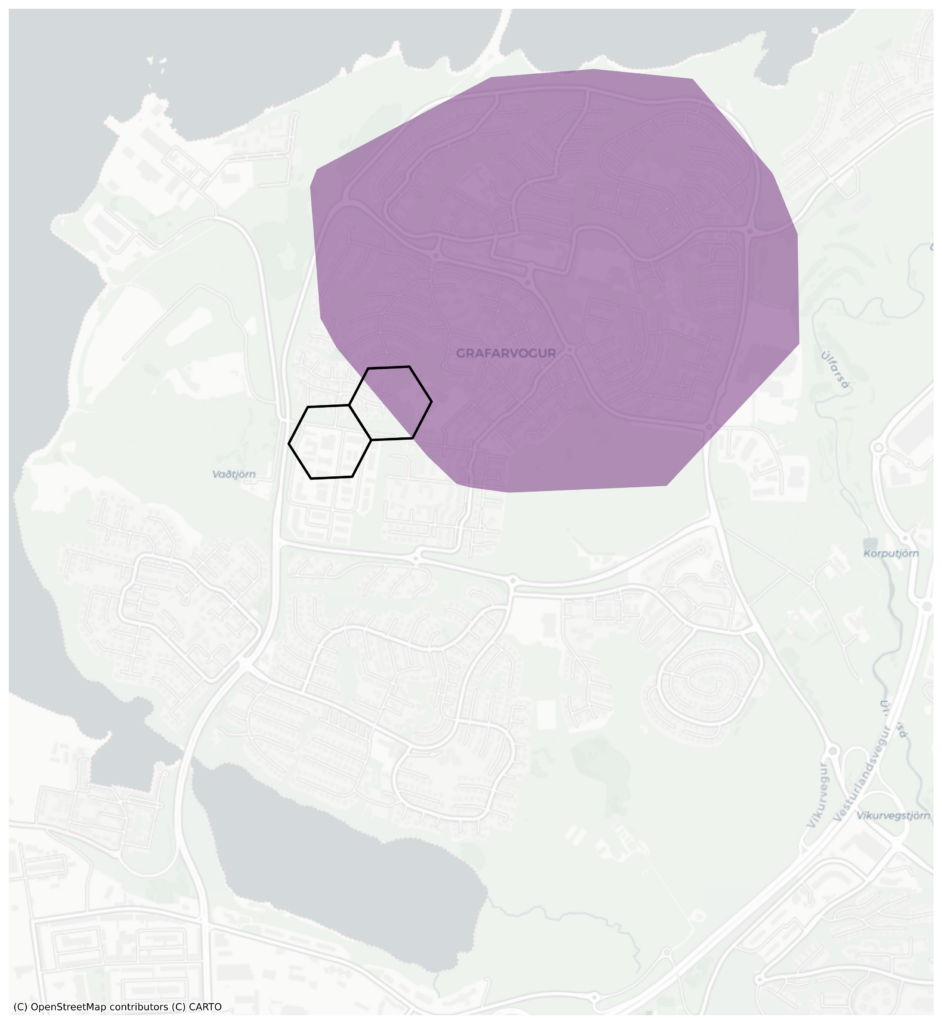 Myndin hér að neðan sýnir aftur vatnasvið Heilsugæslunnar í Grafarvogi og dæmi um tvo sexhyrninga. Vinstri sexhyrningurinn og vatnasviðið skarast ekki og vægi heilsugæstu í þjónustustigi sexhyrningsins er því núll. Hægri sexhyrningurinn og vatnasviðið skarast hins vegar og vægi heilsugæslu í þjónustustigi sexhyrningsins er því 20 prósentustig.